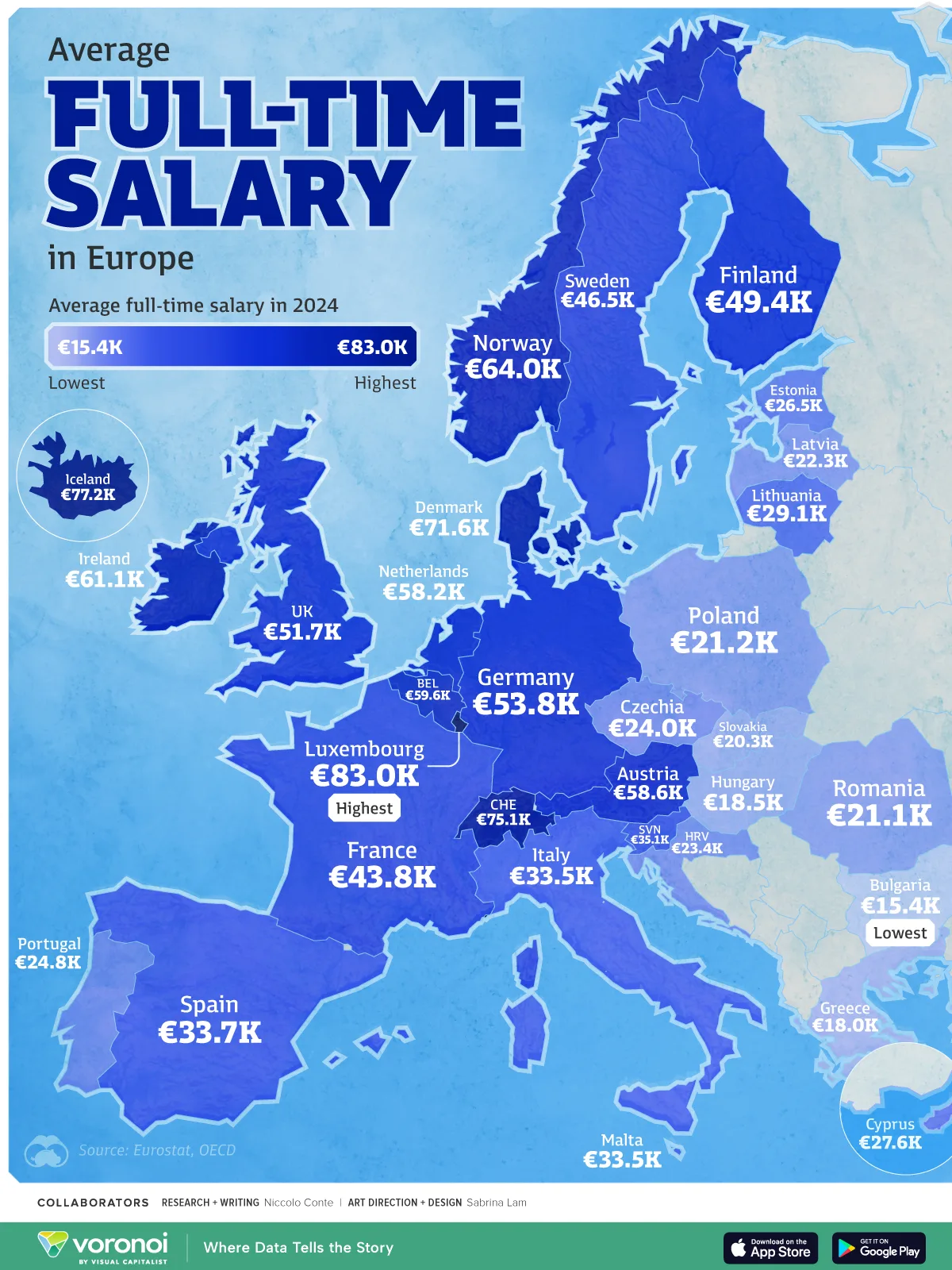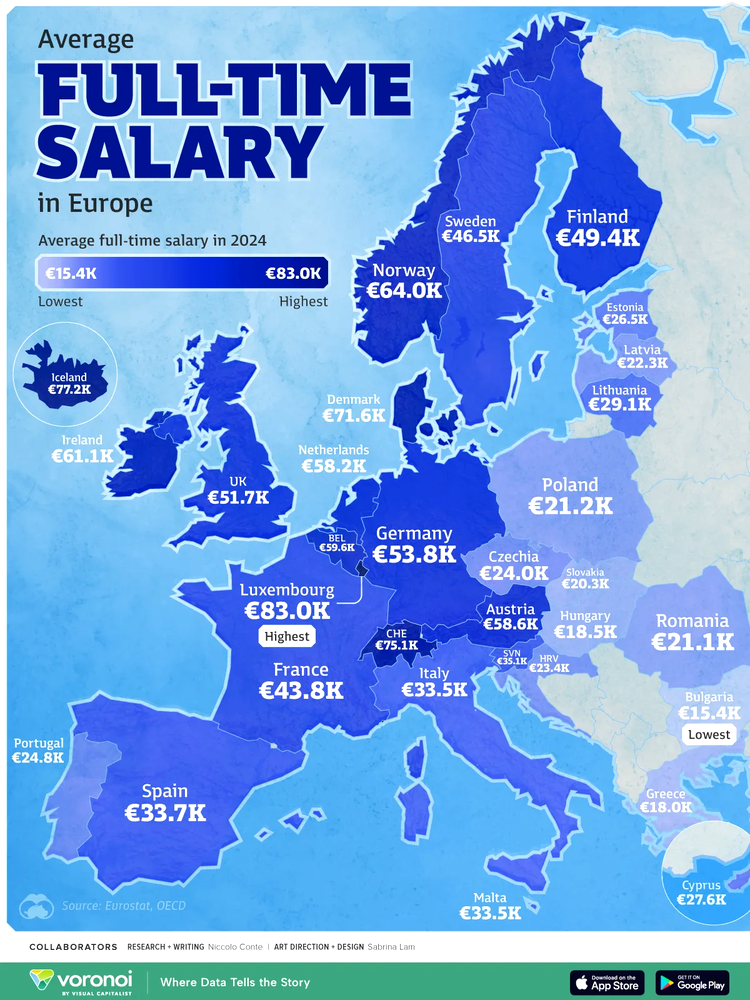 Luxemburg ocupă prima poziție, cu un salariu mediu de 83.000 de euro, urmat de Islanda (77.000 de euro), unde influența sindicatelor este decisivă. În contrast, la polul opus se află Bulgaria, cu doar 15.387 de euro. Diferențele sunt majore chiar și între marile economii: dacă în Germania salariile depășesc 50.000 de euro, în Franța media este de aproximativ 43.790 de euro.