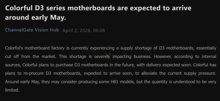 În același timp, Colorful analizează revenirea la plăci de bază bazate pe DDR3, pe fondul dificultăților din lanțul de aprovizionare și al creșterii costurilor pentru memoriile mai noi.