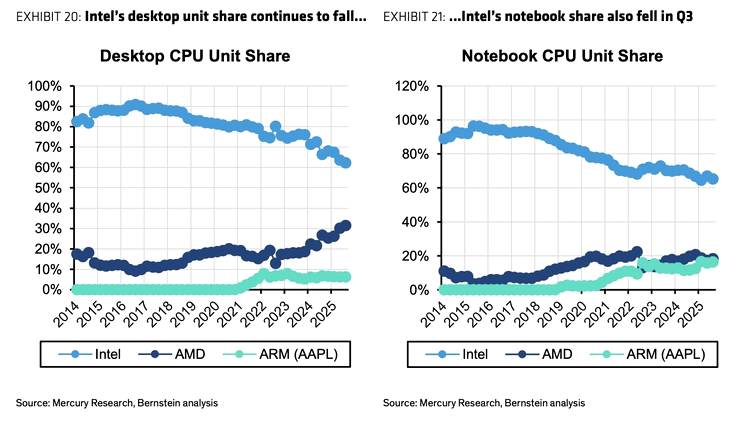 În prezent, Intel a coborât la aproximativ 60% cotă de piață în segmentul desktop, în timp ce AMD a depășit pragul de 30%. Pe piața laptopurilor, AMD pare să stagneze în jurul a 20%, pe fondul competiției tot mai dure venite din partea procesoarelor ARM, unde Apple a profitat cel mai mult de declinul Intel.