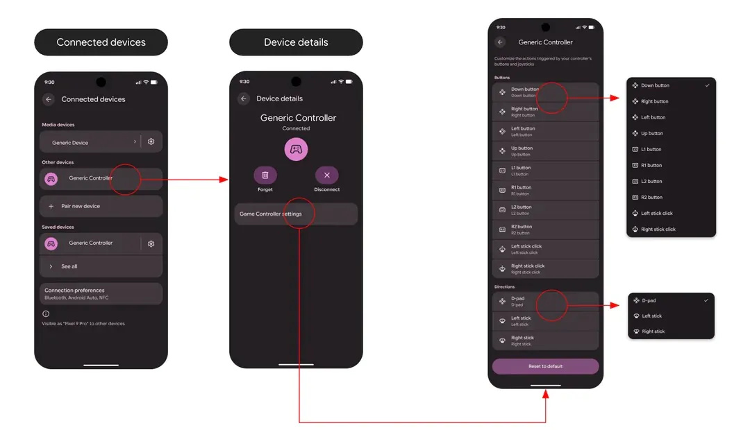 Utilizatorii pot accesa această funcție printr-un nou meniu Game Controller din setări, accesând la Settings > System > Game Controller (Setări > Sistem > Game Controller) pentru gamepad-urile conectate prin cablu. Pentru cele Bluetooth, utilizatorii trebuie să acceseze Settings > Connected devices > Device details (după selectarea gamepad-ului conectat) > Game Controller Settings (Setări > Dispozitive conectate > Detalii dispozitiv (după selectarea gamepadului conectat) > Setări Game Controller).