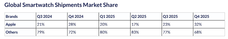 Apple a rămas liderul pieței globale de smartwatch-uri, cu o cotă de 32% din livrările totale. Compania a înregistrat și cea mai rapidă creștere dintre primii cinci producători, cu un avans de 15% de la an la an.