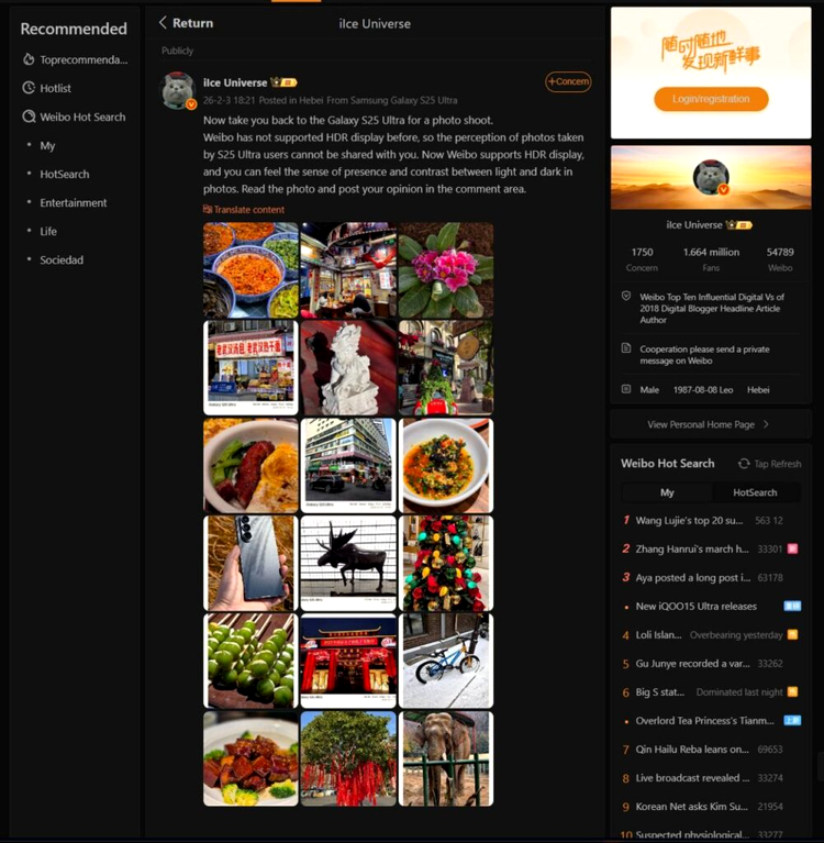 Potrivit cunoscutului tipster @UniverseIce, Samsung Galaxy S25 Ultra suportă acum afișarea conținutului HDR pe platforma Weibo.