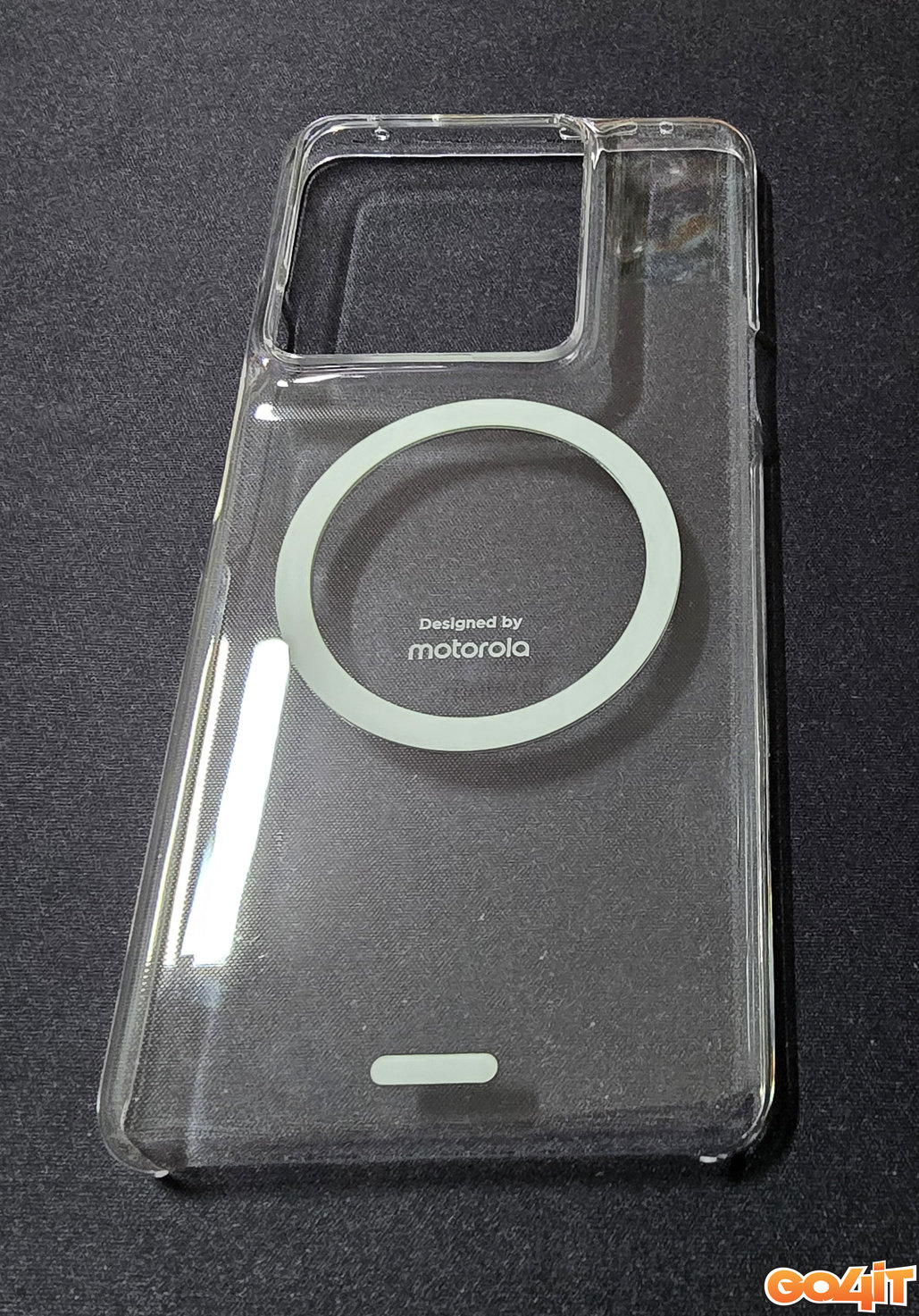 Acest aer elegant este oarecum amplificat și de cutia produsului, care abandonează look-ul “de carton” cu care Motorola ne-a obișnuit în ultimii ani, în favoarea unui aspect mai exclusivist. Nu vă faceți însă iluzii că interiorul cutiei ascunde cine știe ce surprize. Pe lângă izul parfumat caracteristic ambalajelor de la Moto, în cutie regăsim din nou doar strictul necesar, fără încărcător, însă cu o adăugire demnă de luat în seamă: o carcasă din plastic rigid, dotată cu magneți, pentru a putea monta accesorii compatibile MagSafe.