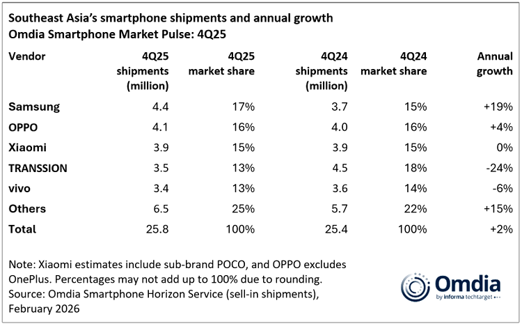 Omdia: Samsung revine pe primul loc în Asia de Sud-Est în 2025, deși livrările de smartphone-uri scad cu 1%