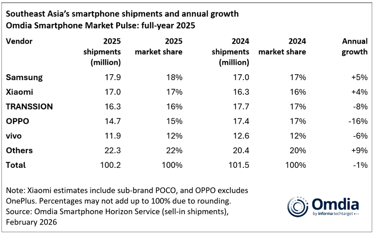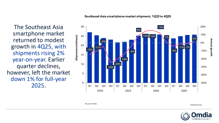 Livrările de smartphone-uri în Asia de Sud-Est au atins 100 de milioane de unități în 2025, înregistrând un declin de 1% față de anul anterior, potrivit celor mai recente date publicate de Omdia. Evoluția mai slabă din primele trei trimestre a tras în jos rezultatul anual.