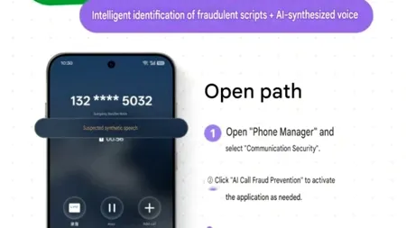 Funcția îmbunătățită de prevenire a fraudelor analizează în timp real conținutul conversațiilor telefonice pentru a identifica tipare suspecte. Atunci când sistemul detectează elemente asociate unor scenarii de înșelătorie, utilizatorul primește imediat o notificare pe ecran care semnalează riscul.