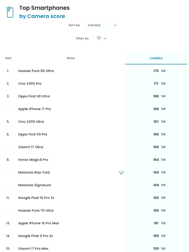 Scorul de 164 de puncte plasează Razr Fold foarte aproape de modele precum iPhone 17 Pro, Find X9 Pro sau Xiaomi 17 Ultra. În același timp, Honor Magic V5 și Galaxy Z Fold7 se situează considerabil mai jos în clasament.