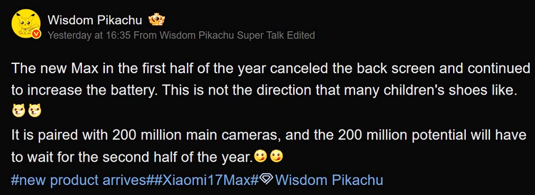 Pe lângă Xiaomi 17 Max, SmartPikachu a menționat și existența unui alt dispozitiv echipat cu un senzor periscopic de 200 MP, programat pentru lansare în a doua jumătate a anului. Deși numele nu a fost dezvăluit, este posibil să fie vorba despre un model din seria Xiaomi 17T.