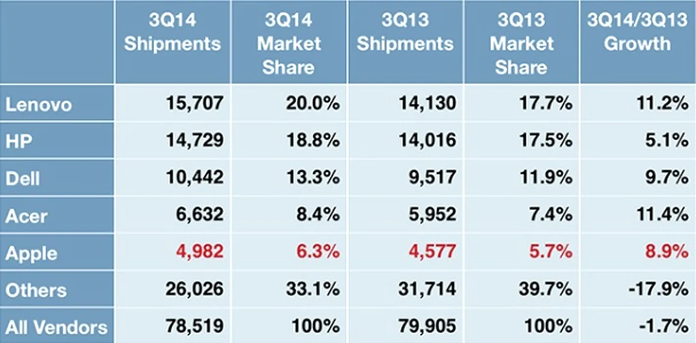IDC: piaţa PC a scăzut mai puţin decât se estima în cel de-al treilea trimestru, Apple intră în Top 5
