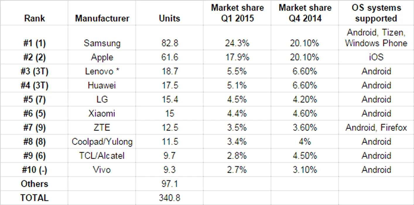 Top 10 producători smartphone în Q1 2015 – Sony şi Microsoft, scoşi din joc de producătorii chinezi